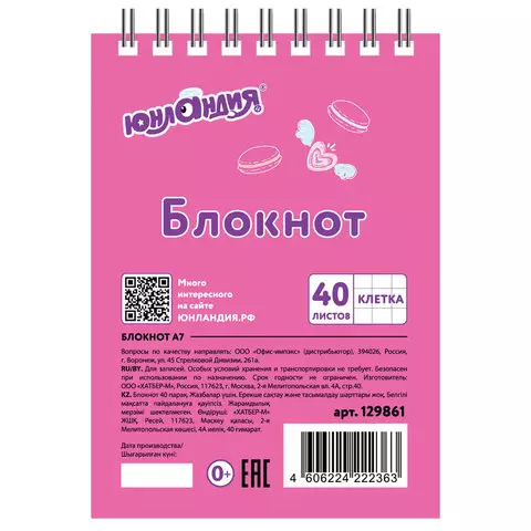 Блокнот формата А7 на евроспирали содержит 40 листов с линовкой в клетку. Имеет верхнее расположение переплета. Обложка выполнена из мелованного картона плотностью 200 г/м2. Внутренний блок состоит из белой офсетной бумаги плотностью 60 г/м2.