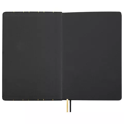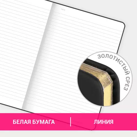 Твердая обложка стилизована под кожу. Имеет закругленные уголки. Подходит для горячего тиснения. 80 листов позволят зафиксировать большой объем информации. Линовка блока в линию. Расстояние между линовками составляет 6 мм. Внутренний блок выполнен из офсета белого цвета плотностью 70 г/м2 и крепится к обложке с помощью книжного переплета. Фольгированный срез блокнота придает изделию шарм. Дополнением являются закладки-ляссе, с помощью которых можно быстро открыть нужную страницу. Формат блокнота А5 (135х205 мм) позволит владельцу поместить его в кейс или сумку малых габаритов.
