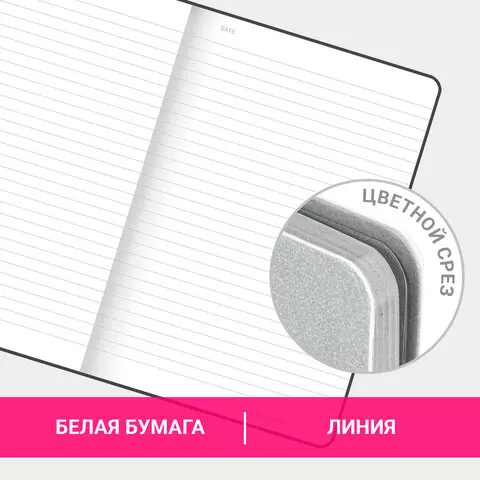 Мягкая интегральная обложка стилизована под кожу. Имеет закругленные уголки. Подходит для горячего тиснения. 80 листов позволят зафиксировать большой объем информации. Линовка блока в линию. Расстояние между линовками составляет 6 мм. Внутренний блок выполнен из офсета белого цвета плотностью 70 г/м2 и крепится к обложке с помощью книжного переплета. Прокрашенный срез блокнота придает изделию шарм. Дополнением является закладка-ляссе, с помощью которой можно быстро открыть нужную страницу. Формат блокнота А5 (140х200 мм) позволит владельцу поместить его в кейс или сумку малых габаритов.