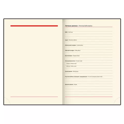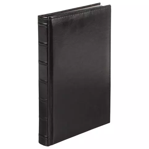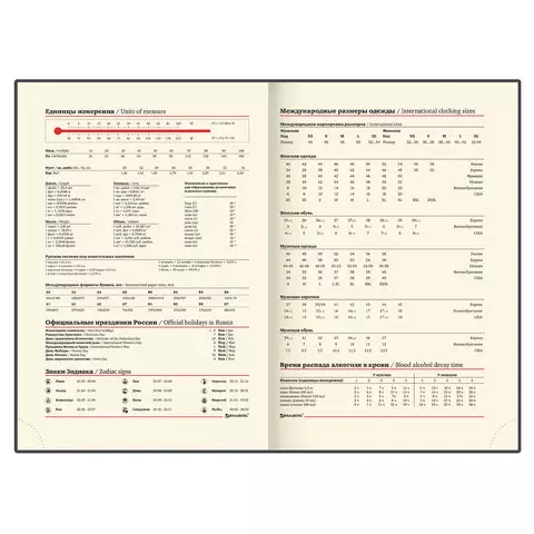 Внутренний блок включает 160 листов тонированной бумаги плотностью 70 г/м2. Каждая страничка имеет перфорированный угол. Благодаря стандартному формату А5 ежедневник удобно использовать как в офисе, так и на выездных деловых встречах. Твердая обложка стилизована под старинную кожу, подходит для горячего тиснения. Срез ежедневника фольгинирован черной фольгой, что придает ему особый шарм. Дополнением является закладка-ляссе, с помощью которой при необходимости можно быстро открыть ежедневник на нужной странице. Помимо прочего ежедневник снабжен обширным справочным материалом.