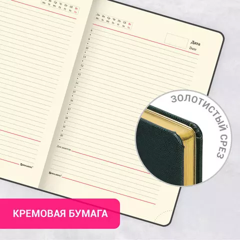 Внутренний блок включает 160 листов тонированной бумаги плотностью 70 г/м2. Каждая страничка имеет перфорированный угол. Благодаря стандартному формату А5 (138х213 мм) ежедневник удобно использовать как в офисе, так и на выездных деловых встречах.