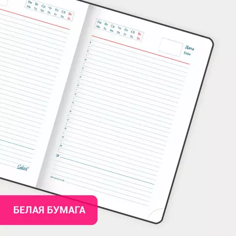 Внутренний блок включает 160 листов белой бумаги плотностью 70 г/м2. Каждая страничка имеет перфорированный угол. Твердая обложка, прошитая по периметру и стилизованная под гладкую кожу фиксируется магнитной застежкой, поэтому ежедневник не откроется в сумке или портфеле и страницы не помнутся.