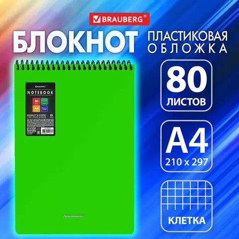 Блокнот БОЛЬШОГО ФОРМАТА А4 80л, обложка пластик, клетка, BRAUBERG Metropolis, ЗЕЛЕНЫЙ, 115575