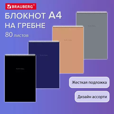 Блокнот БОЛЬШОЙ ФОРМАТ А4 198х297 мм, 80 л., гребень, подложка, клетка, BRAUBERG "Minimal Classic", 116424