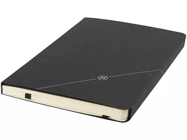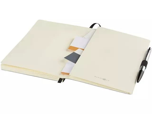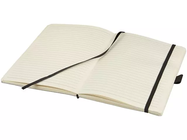 Блокнот Revello. Мягкий на ощупь, гибкий блокнот (размер А5 для ориентации) со встроенной эластичной застежкой, закладкой, петелькой для ручки и кармашка для документов на внутреннем форзаце сзади. 80 листов кремовой линованной бумаги (80г/м2). Упакован в черную коробку-рукав. Кожа ПУ.