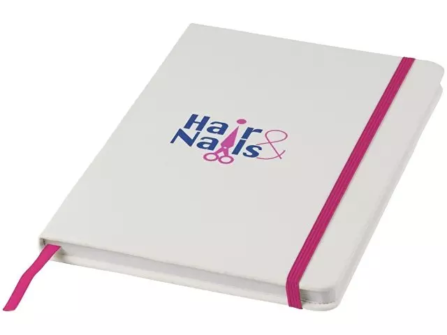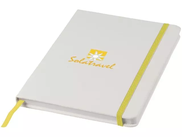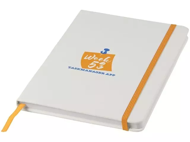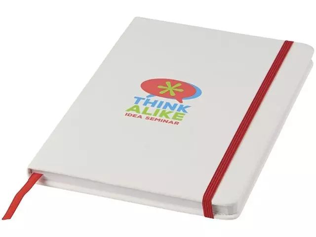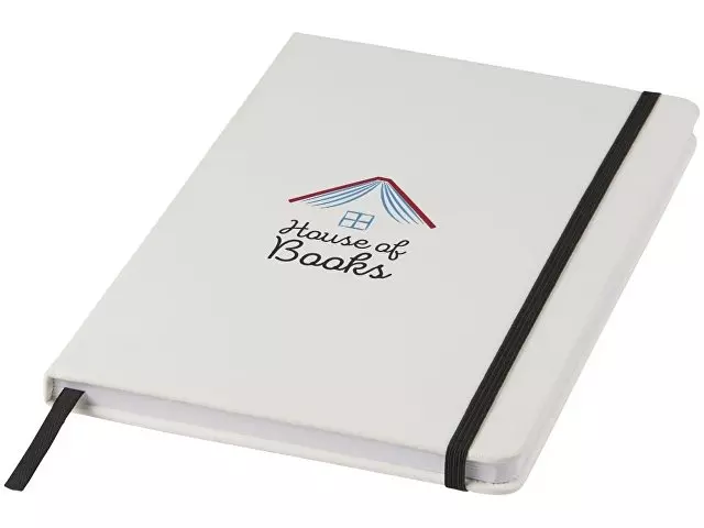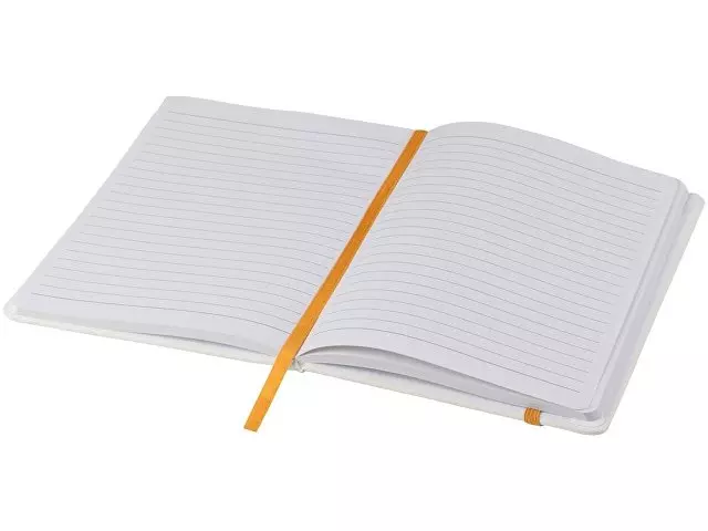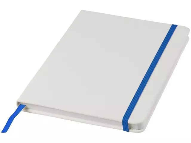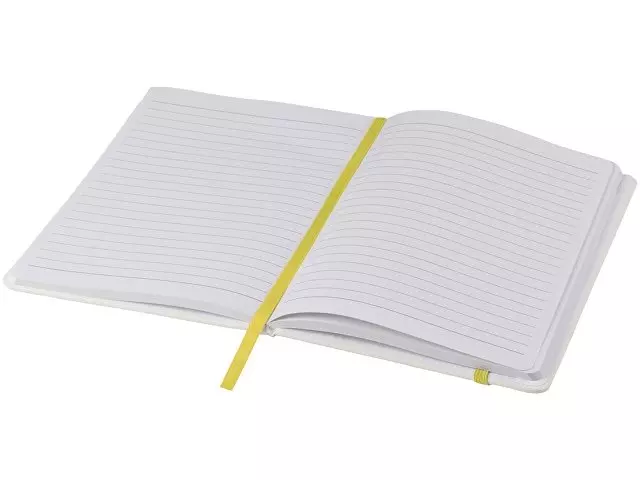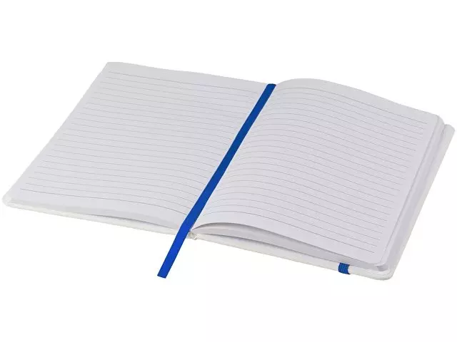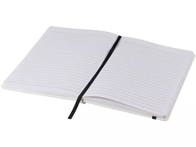 Белый блокнот A5 с цветной эластичной закладкой и резинкой. 96 страниц (60g/m2), линованная бумага. На обложке возможна цифровая печать.