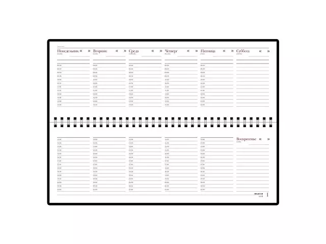 Недатированный планинг выпускается размером 305*130 мм и содержит 128 страниц (блок 292 х100 мм). Для них выбрана высококачественная белая бумага плотностью 70 грамм. Разворот представляет собой разметку на 7 дней недели с графами с указанием времени. Месяц и день недели указаны на русском и английском языках. Первые 15 страниц содержат справочные сведения из различных областей на русском языке. Крепление листов на открытом гребне способствует быстрому переходу по страницам. Современная, практичная обложка из приятного на ощупь материала с легким прорезиненным эффектом хорошо подходит для тиснения. Декоративная прострочка нитью в тон подчеркивает закругленную форму обложки.
