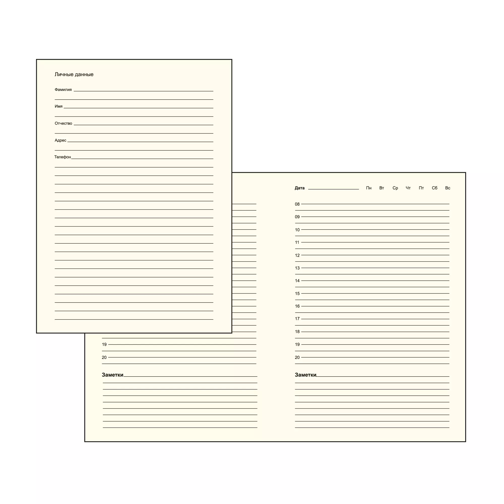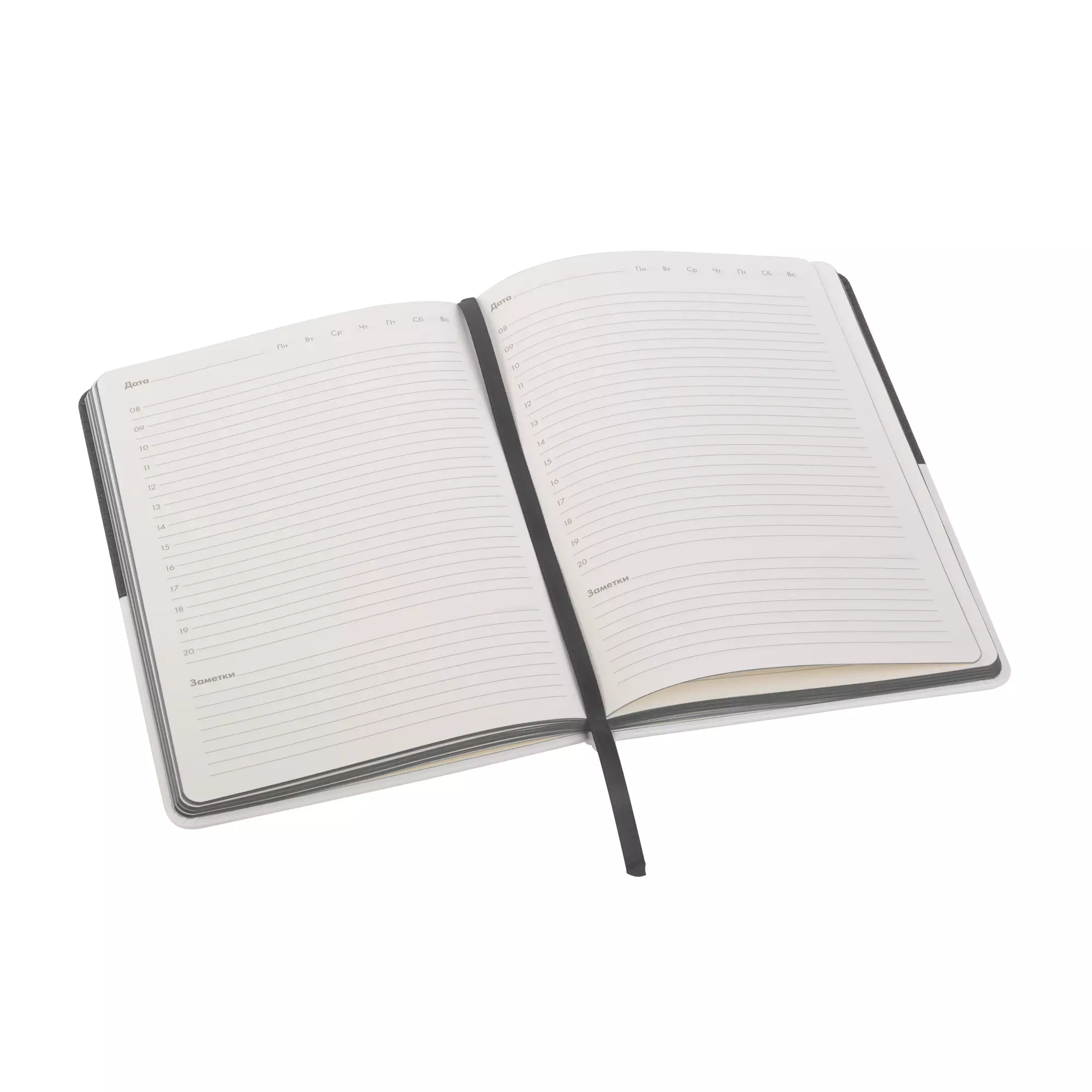 Формат: А5 Количество страниц: 256 Бумага: кремовая, плотность 70 г/м2 Недатированный блок, одноцветная серая графика Форзац: кремовый Нахзац: кремовый, с конвертом Цветной срез Комбинированная двуцветная обложка: верх - фактурный материал, имитирующий текстуру ткани низ - гладкий матовый материал Твердый переплет