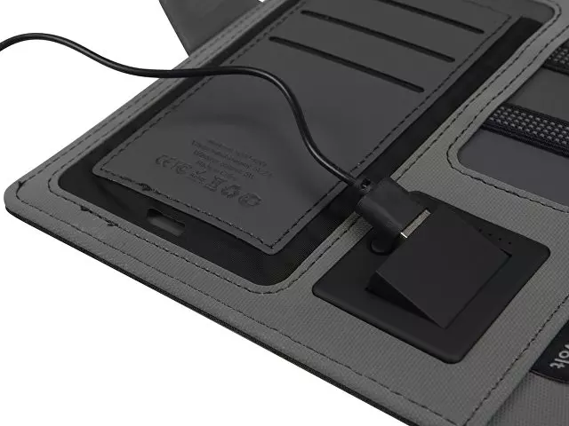Органайзер «Powernote» — стильный бизнес-подарок, который в полной мере воплощает идею многофункциональности. С его помощью можно заряжать гаджеты как беспроводным способом, так и через кабель, эргономично хранить целый ряд предметов — от ручек и проводов до кредитных карт — и даже делать записи. Элегантность внешнего вида дополняется приятной текстурой обложки из мягкого полиэстера и высоким качеством внутренней отделки с элементами soft-touch покрытия. Практичный и технологичный аксессуар, который в состоянии заменить сразу несколько вещей. - Встроенный пауэрбанк емкостью 5000 мАh. - Возможность зарядки как беспроводным способом, так и через кабель. - Удобная магнитная застежка. - Качественные материалы. - Отделение для телефона. - Блокнот для записей 64л.