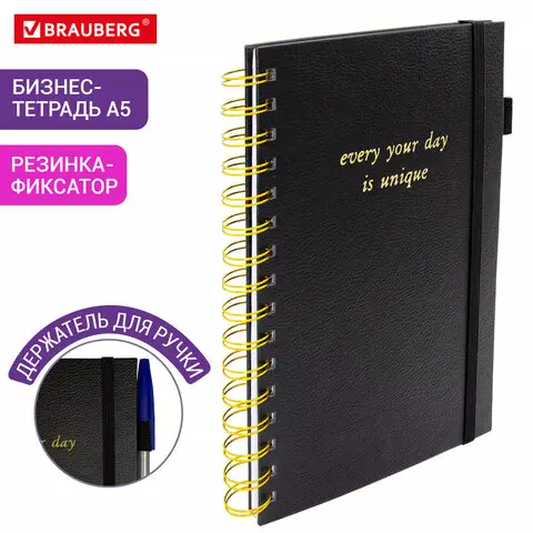 Бизнес-тетрадь на гребне А5 148х216мм BRAUBERG Calipso под кожу, резинка, клетка, 80л, черная, 116252