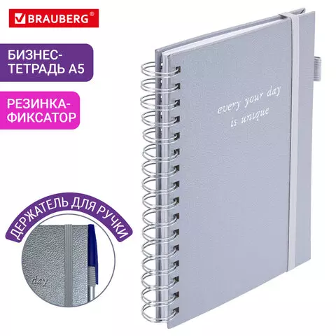 Бизнес-тетрадь на гребне А5 148х216мм BRAUBERG Calipso под кожу, резинка, клетка, 80л, серая, 116253