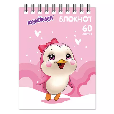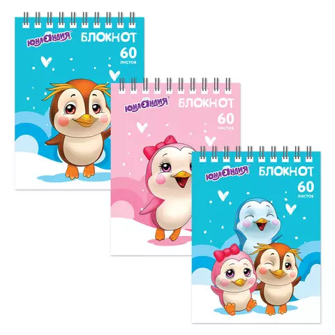 Блокнот МАЛЫЙ ФОРМАТ (108х146 мм) А6, 60 л., гребень, картон, клетка, ЮНЛАНДИЯ, "ПИНГВИНЯТА", 129832