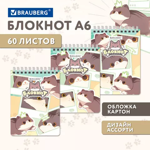 Блокнот МАЛЫЙ ФОРМАТ А6 97х145мм, 60л, гребень, картон, клетка, BRAUBERG МИЛЫЕ КОТЫ, 116987