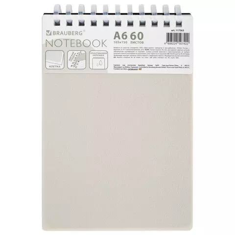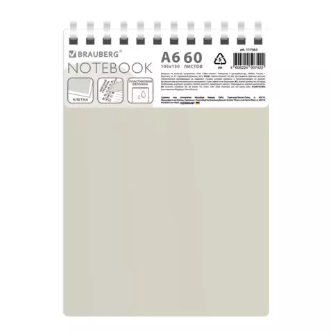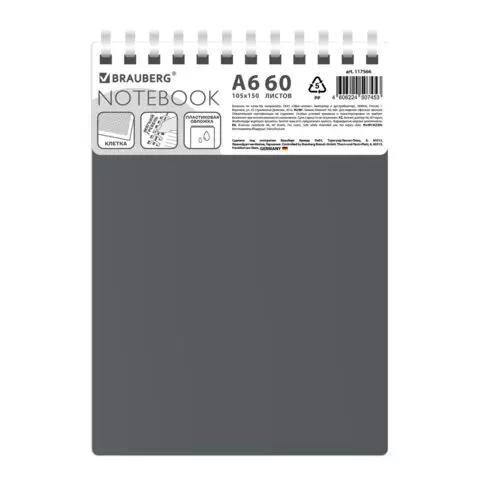 Блокнот МАЛЫЙ ФОРМАТ А6 60л, BRAUBERG, силиконовый гребень, обложка пластик, клетка, серый, 117566