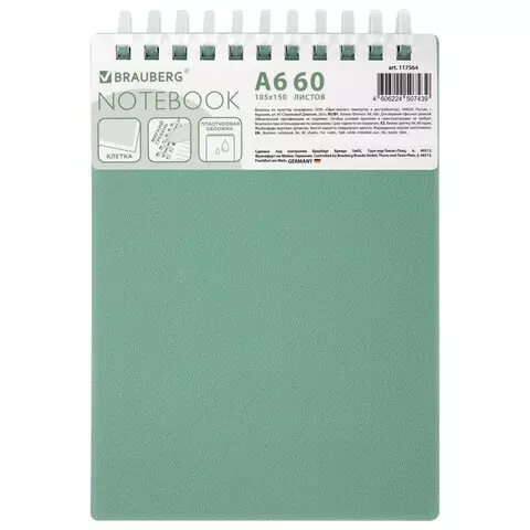 Блокнот МАЛЫЙ ФОРМАТ А6 60л, BRAUBERG, силиконовый гребень, обложка пластик, клетка, зеленый, 117564