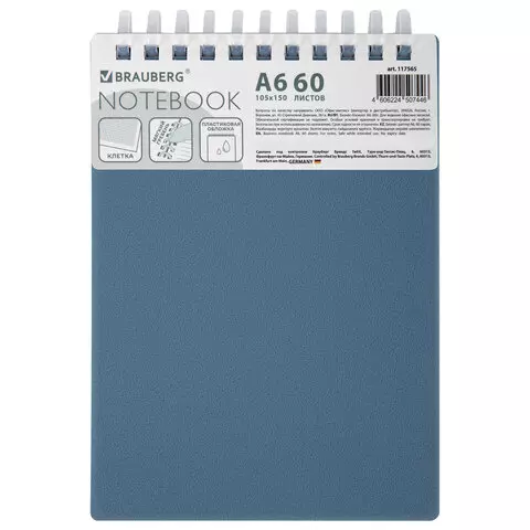Блокнот МАЛЫЙ ФОРМАТ А6 60л, BRAUBERG, силиконовый гребень, обложка пластик, клетка, синий, 117565