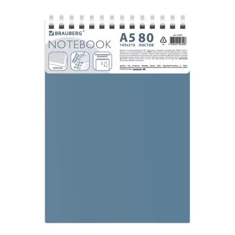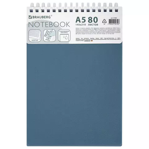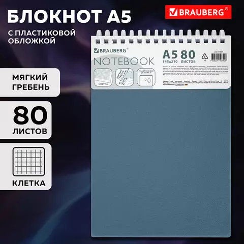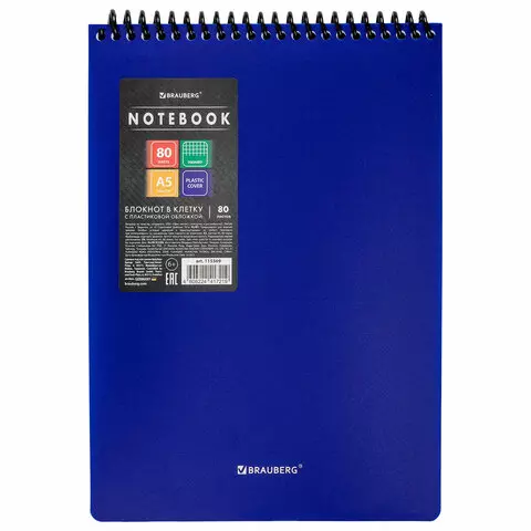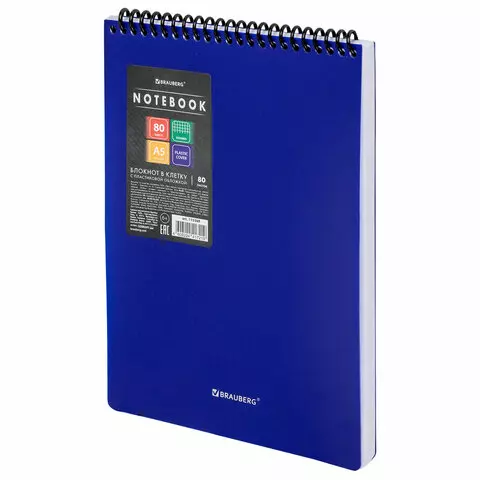 Блокнот А5 80л, BRAUBERG, силиконовый гребень, обложка пластик, клетка, синий, 117561