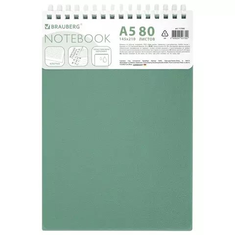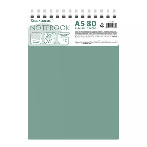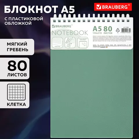 Блокнот А5 80л, BRAUBERG, силиконовый гребень, обложка пластик, клетка, зеленый, 117560