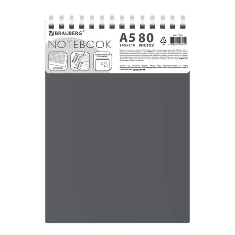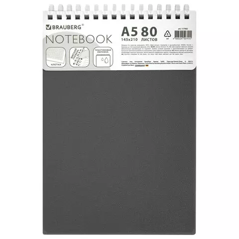 Блокнот А5 80л, BRAUBERG, силиконовый гребень, обложка пластик, клетка, серый, 117562