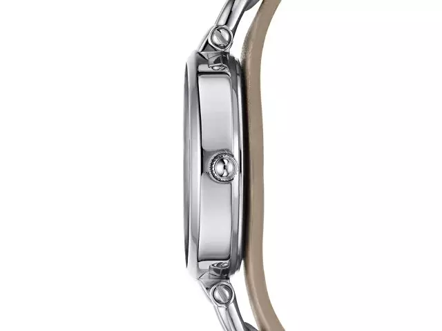 корпус- серебристый, циферблат- кремовый, крепление- светло-коричневый