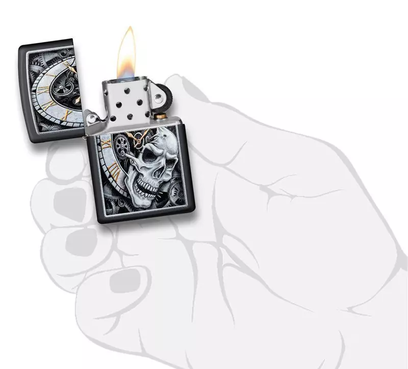 Зажигалка ZIPPO Skull Clock Design с покрытием Black Matte, латунь/сталь, чёрная, матовая, 36x12x56 мм