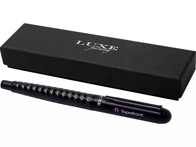 Ручка-роллер с эксклюзивным дизайном сочетает в себе шикарный внешний вид и надежность. Корпус эргономичен для использования. Ручка заправлена черными чернилами и упакована в подарочную коробку LUXE. Подарочный набор можно дополнить стилусом или шариковой ручкой с нажимным механизмом. Алюминий.