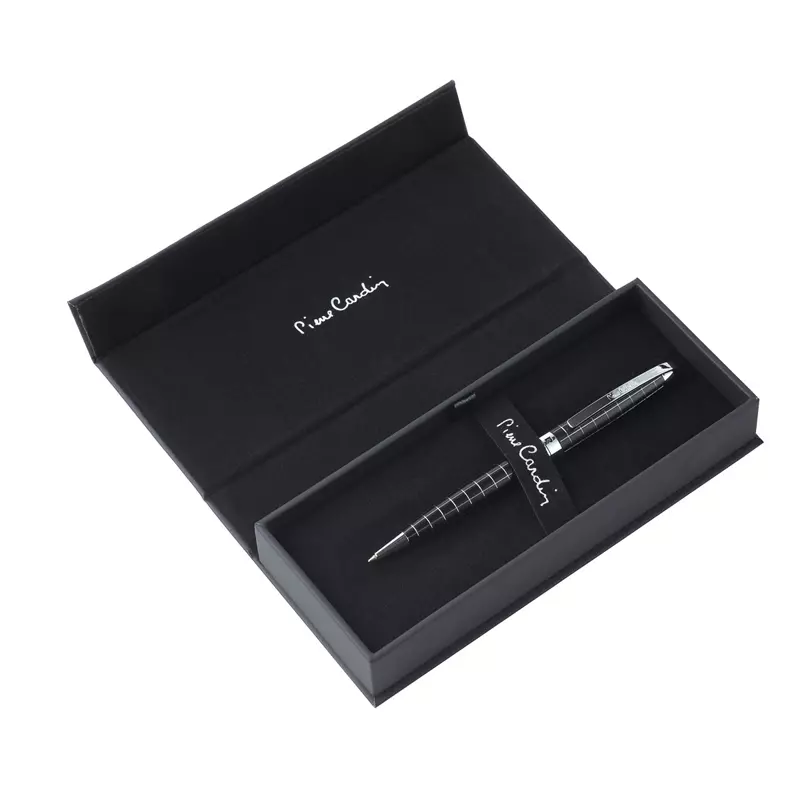 Ручка шариковая Pierre Cardin PROGRESS. Корпус - латунь и лак. Отделка и детали дизайна - сталь, хром, гравировка по всему корпусу. Поле под нанесение логотипа 3,0 х 0,5 см. Цвет - черный и серебристый. Упаковка В.
