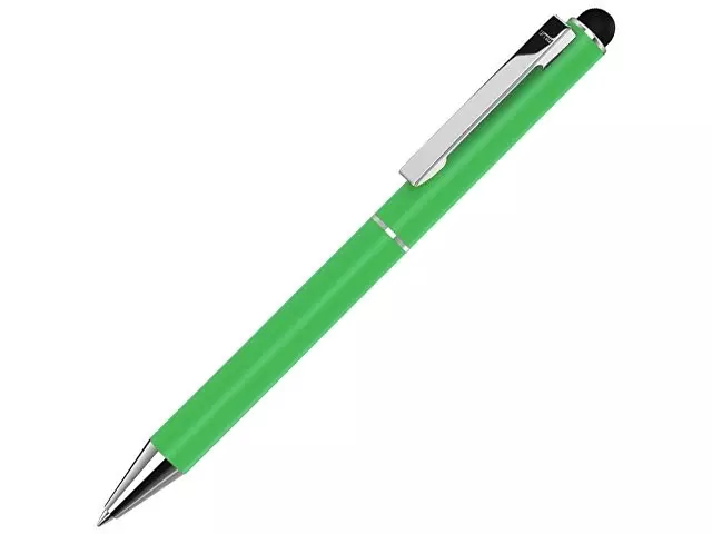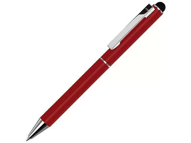 Металлическая шариковая ручка с матовой поверхностью, металлическим клипом, металлическим наконечником и кнопкой с глянцевой серебристой отделкой, прорезиненным ободом для сенсорного регулирования.