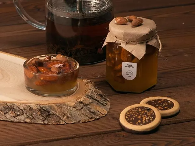 Мед и орехи прекрасно сочетаются друг с другом, образуя оригинальный и запоминающийся вкус. Медовый десерт идеально подойдет для чаепития, поэтому подобный подарок можно также дополнить чаем. Т.к. продукт состоит из натуральных ингредиентов, допускается его засахаривание