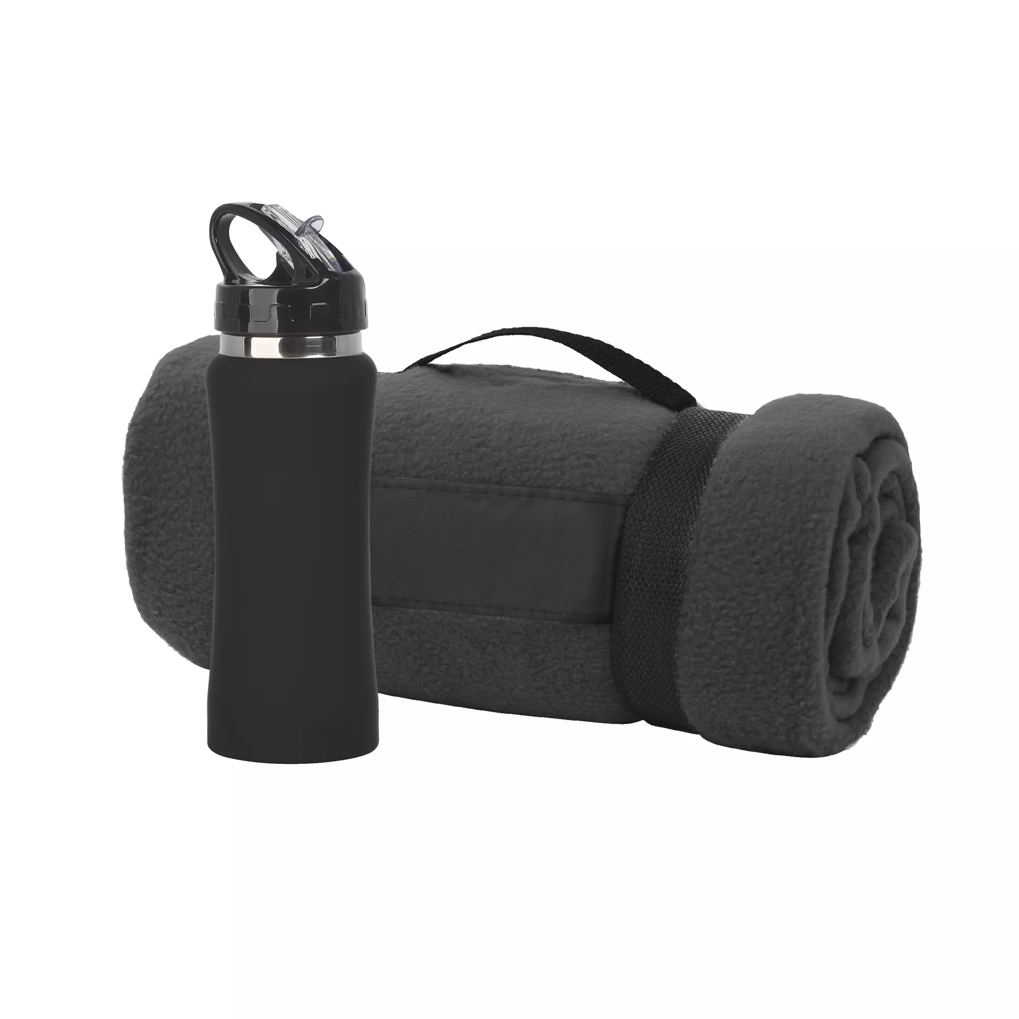 В набор входят: арт. 7803 бутылка спортивная "Индиана" с покрытием soft touch;  арт. 8376 плед "Байкал";  коробка подарочная с ложементом.