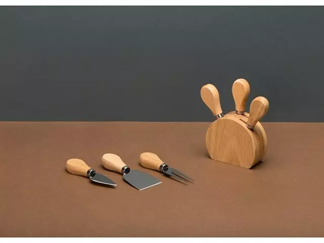 Набор состоит из ножей для сыра, подставки и удобной крафт-коробки. Кухонные инструменты выполнены из надежного каучукового дерева. Оно устойчиво к воздействию влаги, перепадам температуры и большим нагрузкам. Приборы устанавливаются в удобную деревянную подставку, где их можно хранить после использования. В комплект входят: - листовидный нож для твердых сортов сыра, - нож-лопатка для мягких сортов сыра, - вилка для сыра.
