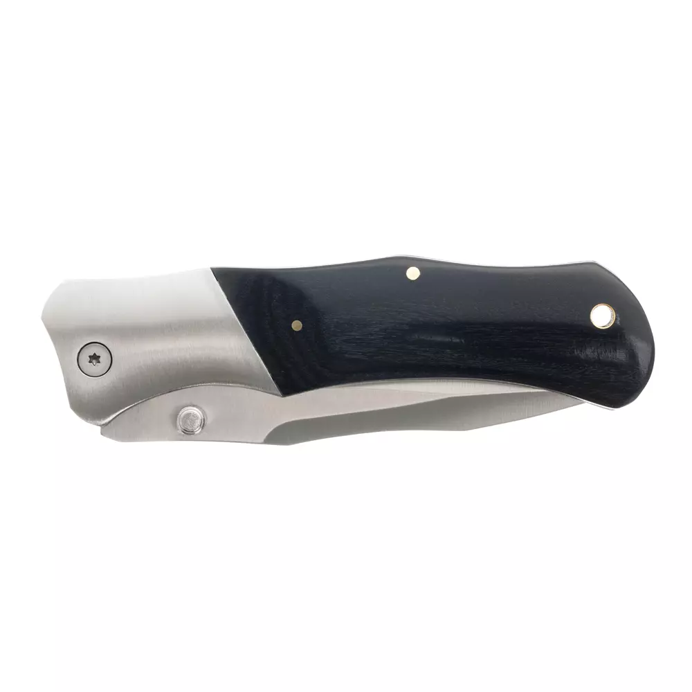 Нож складной Stinger, 70 мм (черный), рукоять: сталь/дерево (золот.-черн.), с клипом, коробка картон