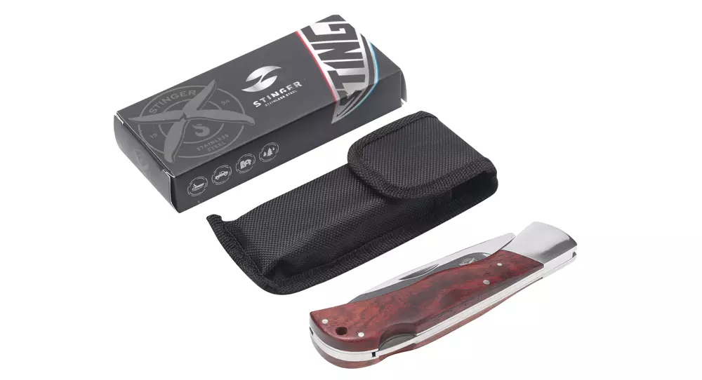 Нож складной Stinger, 104 мм длина лезвия, (серебристый), рукоять: сталь/дерево (серебристо-коричневый), картонная коробка