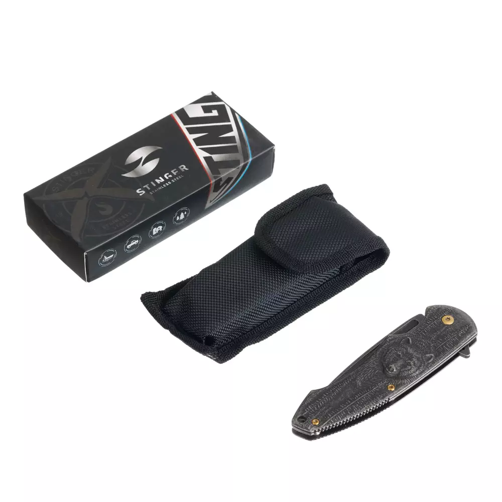 Нож складной Stinger, 82 мм (чёрный), рукоять: сталь (чёрный с медведем), картонная коробка