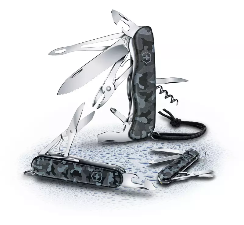 Нож перочинный VICTORINOX Skipper, 111 мм, 17 функций, чёрный шнурок на руку, фиксатор лезвия "liner lock", стальное лезвие с серейторной заточкой, рукоять из нейлона цвета "серо-синий камуфляж"