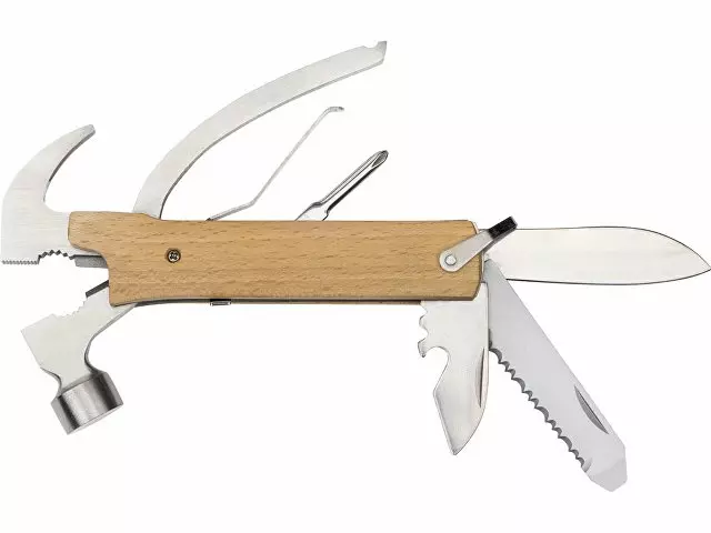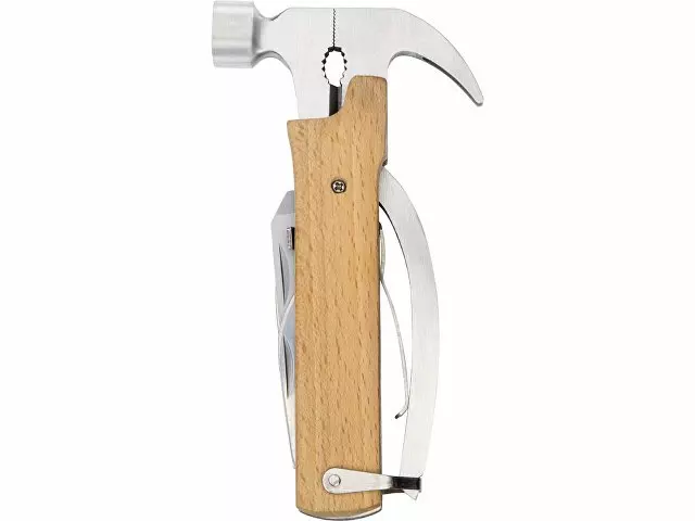 Многофункциональный инструмент, который выручит дома, на даче, в путешествии, походе и во множестве других ситуаций. Полностью сделан из металла и декорирован накладками из натурального дерева. Чехол в комплекте. Основные функции: - Молоток - Плоскогубцы - Гвозодер - Кусачки - Пила - Напильник - Нож - Открывашка - Отвертка (крестовая и плоская)