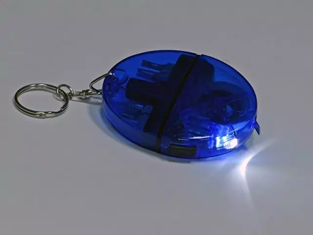 Оригинальный и многофункциональный брелок обладает ярким внешним видом, за которым скрывается весьма полезное содержание. Внутри брелока встроена рулетка, набор отверток и фонарик.