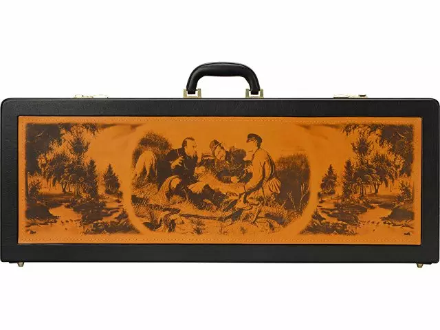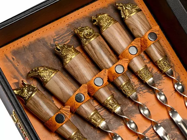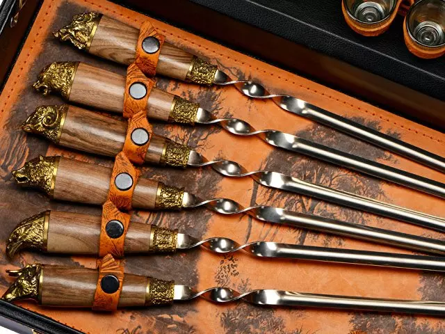 Кейс из сплит-кожи, с повышенной износостойкостью, внутренняя отделка натуральная кожа с художественным выжиганием В комплект входит: Фляга 240мл (нерж.сталь)– 1шт. Фляга 480мл (нерж.сталь)- 1шт. Стопка 40мл (нейзильбер)- 6шт. Фонарик- 1шт. Поднос (нейзильбер)- 6шт. Нож разделочный (нерж. сталь) 45х13, рукоять орех, бронзовое литье– 1 шт. Шампура 810 мм (нерж. сталь) ручка орех, бронзовое литье– 6 шт.