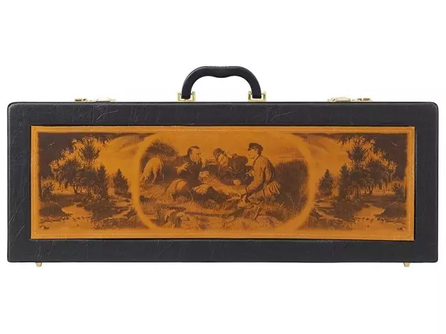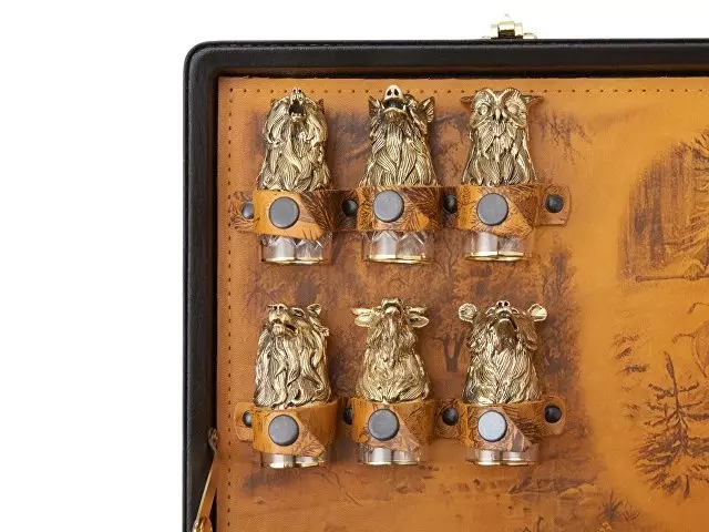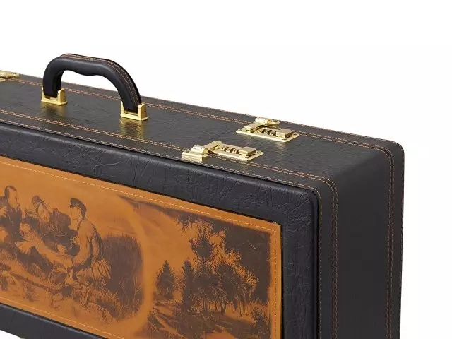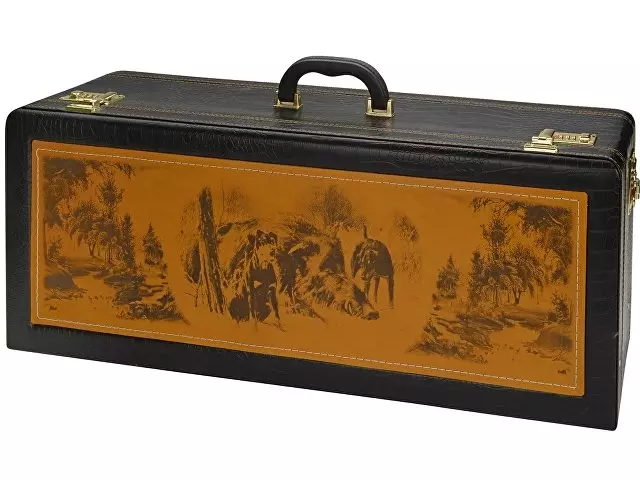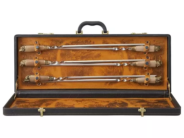 Кейс из сплит-кожи, с повышенной износостойкостью, с картиной В комплект входит: Шампура "Люкс" - 6 шт. Поднос (нейзильбер)- 4 шт. Стопка чарка- 4 шт. Нож разделочный (нерж.сталь) с рисунком- 1 шт. Нож "Тюльпан" (нерж. сталь) – 1 шт. Фляжка 1л в чехле- 1 шт. Мангал 350мм- 1 шт.