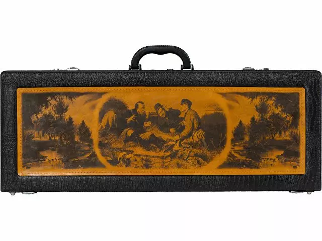 Кейс из сплит-кожи, с повышенной износостойкостью, с картиной, внутренняя отделка натуральная кожа с художественным выжиганием. В комплекте: Стопка 40мл (нейзильбер)– 6 шт. Нож "Тюльпан" (нерж. сталь) 45х13, рукоять орех, бронзовое литье, в чехле с художественным выжиганием– 1 шт. Нож разделочный (нерж. сталь) 45х13, рукоять орех, бронзовое литье в чехле из натуральной кожи с выжиганием– 1 шт. Нож выкидной, ручка орех- 1шт. Шампура 630 мм (нерж. сталь), ручка орех, бронзовое литье– 6 шт. Поднос (нейзильбер)– 6 шт. Мангал 350мм -1шт. Шампура 350мм, в чехле из натуральной кожи с декором-6шт.