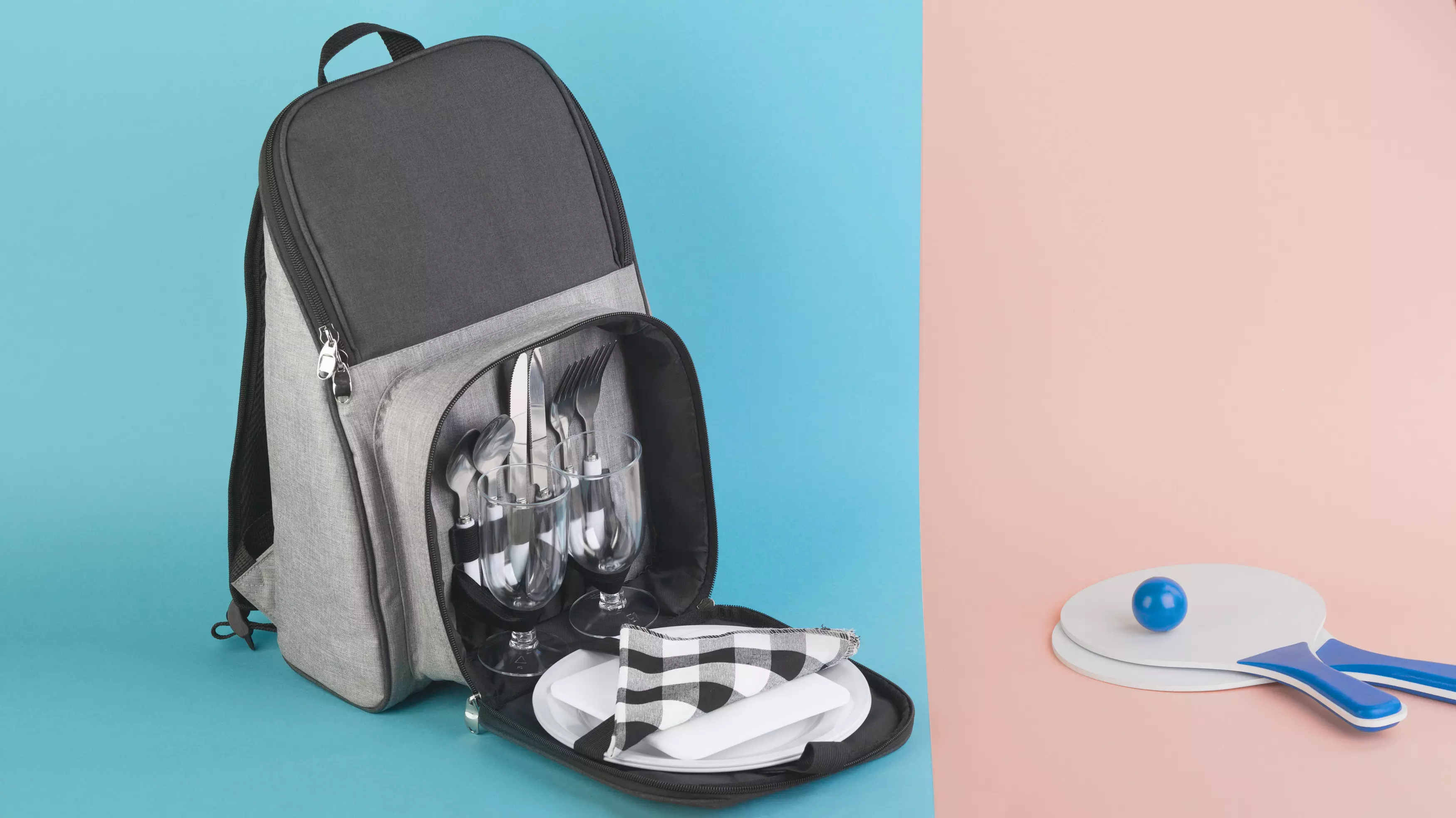 Рюкзак для пикника рассчитан на 2 персоны с холодильным отделением. В набор входят: фужеры, салфетки, сервировочные вилки, ложки, тарелки.
