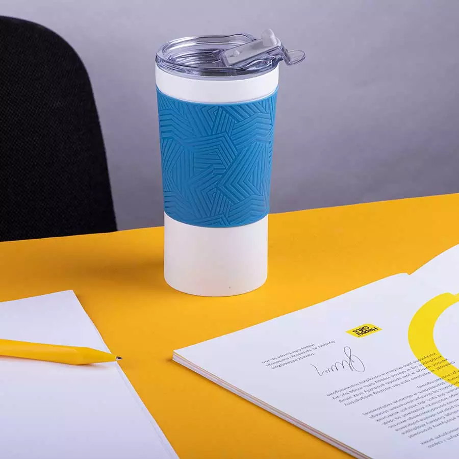 Термокружка вакуумная 'Funny" белая, голубой силикон