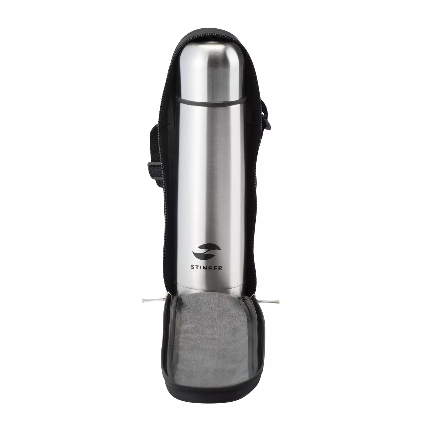 Термос Stinger с чехлом, 0,5 л, узкий, сталь, искусств. кожа, серебристый, чехол - чёрный
