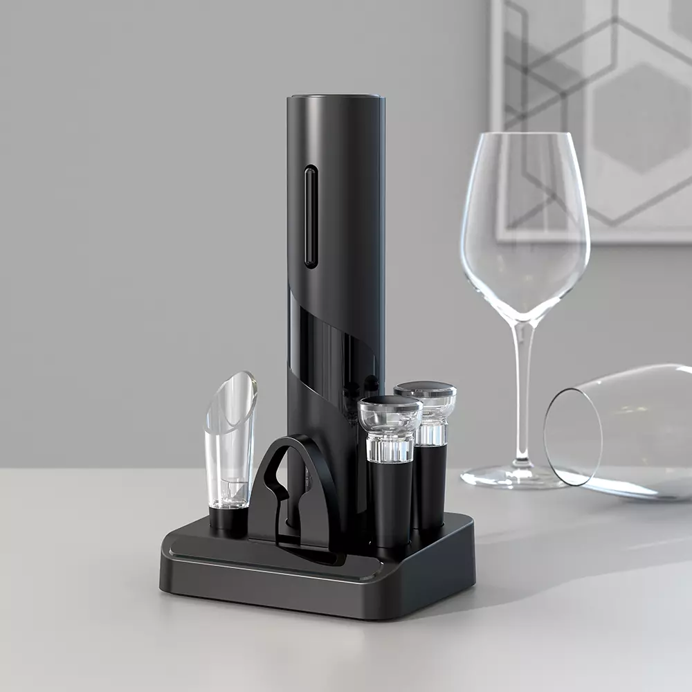 В наборе имеется все необходимое: электрический штопор (не перезаряжаемый), нож для фольги, вакуумная пробка, воронка-аэратор для вина (батарейки типа АА в комплект не входят) Все компоненты набора для удобства размещаются на специальной подставке-органайзере.
