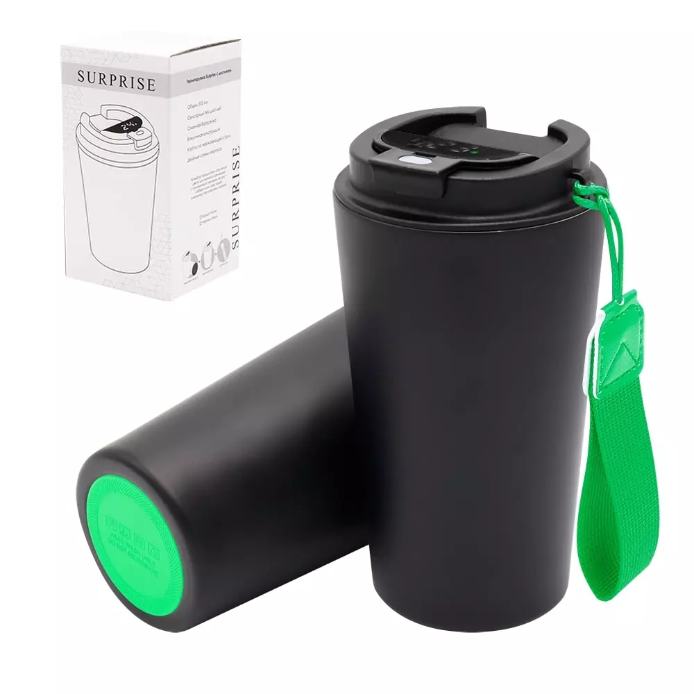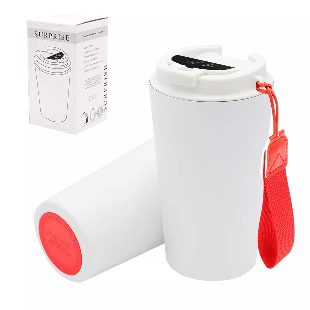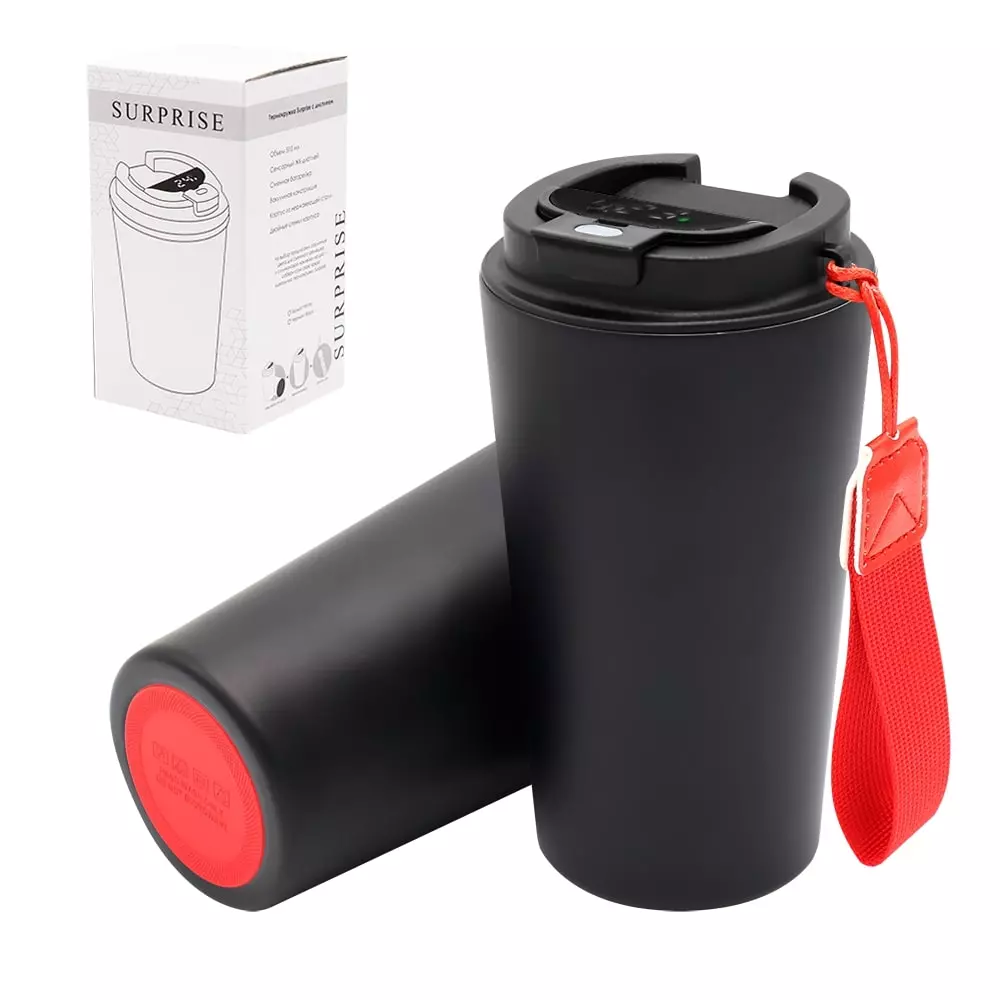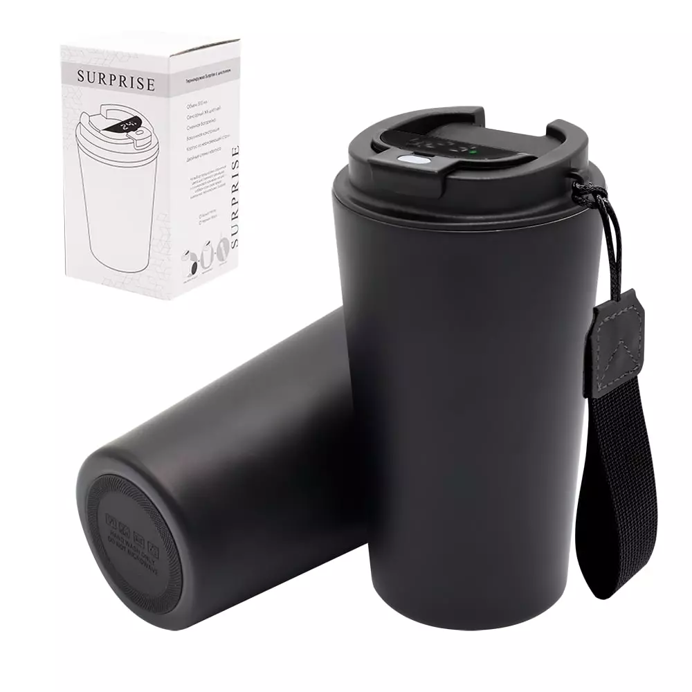 Термокружка Surprise To Go с дисплеем выполнена из пищевой нержавеющей стали. Имеет двойные стенки с вакуумной изоляцией, а крышка изготовлена из пищевого безопасного для человека пластика. Термокружка Surprise To Go не только сохраняет ваши напитки горячими, но и показывает температуру напитка! Уникальная особенность данной термокружки – наличие сенсорного индикатора температуры, расположенного в крышке. Чтобы узнать температуру напитка внутри кружки, достаточно прикоснуться к поверхности крышки. Работает от 1 батарейки типа CR2032 (в комплекте), которую в последующем можно самостоятельно заменить. - качественные и безопасные материалы - двойные стенки из нержавеющей стали - сенсорный ЖК-дисплей - информация о температуре жидкости - батарею можно заменить самостоятельно -отличные теплоизоляционные свойства - эргономичный дизайн - удобная форма В комплект уже входит силиконовая накладка и шнурок. Насладись своим кофе в компании термокружки Surprise To Go!