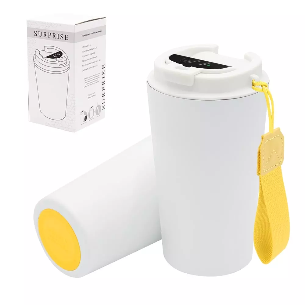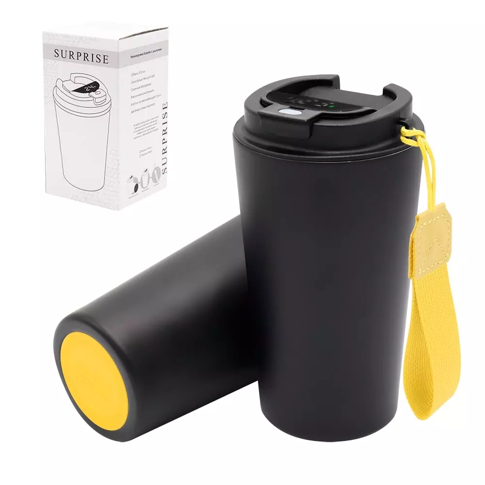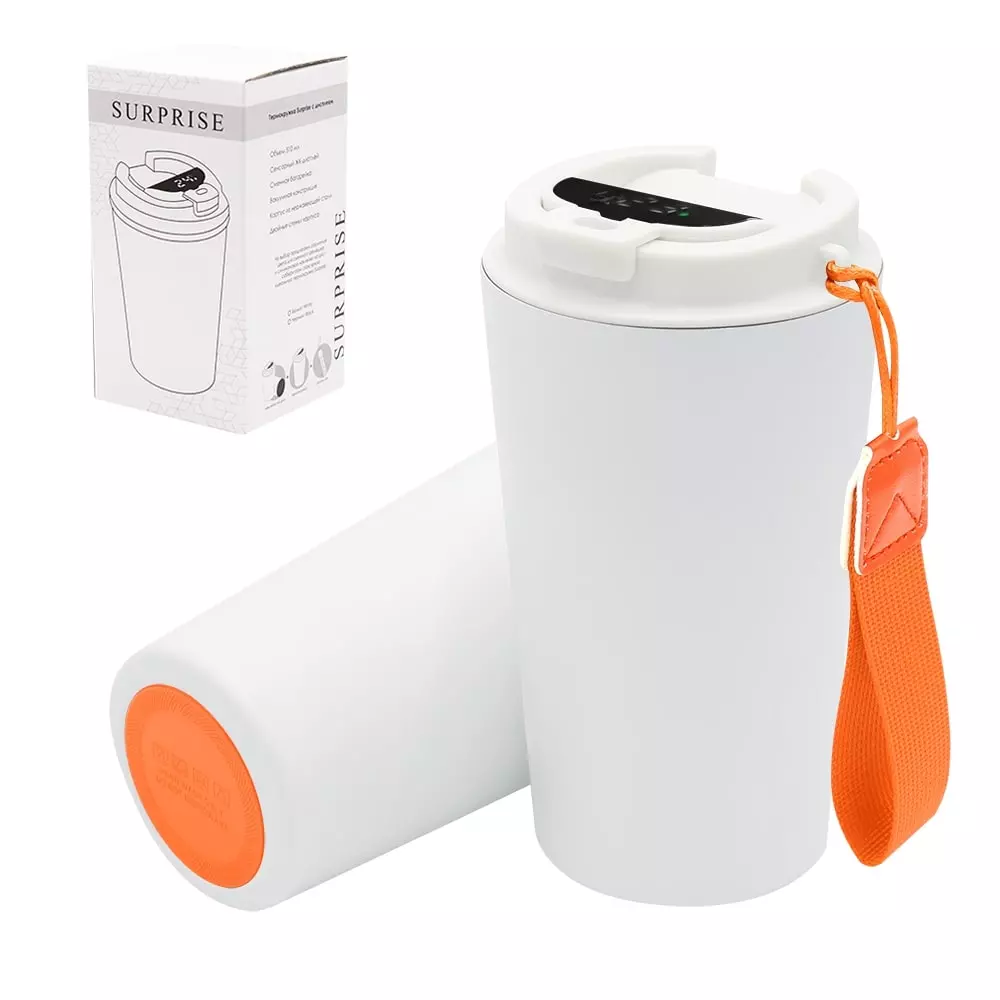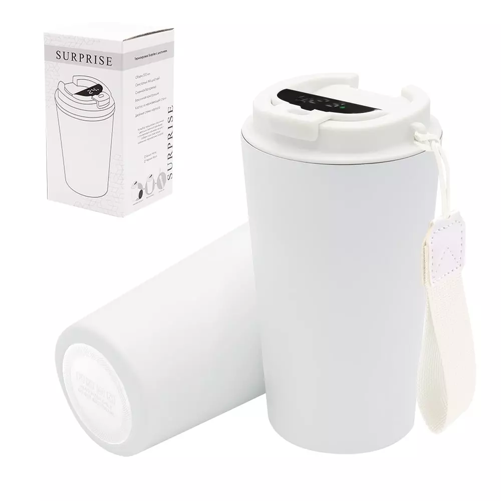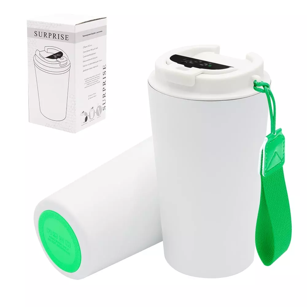 Термокружка Surprise To Go с дисплеем выполнена из пищевой нержавеющей стали. Имеет двойные стенки с вакуумной изоляцией, а крышка изготовлена из пищевого безопасного для человека пластика. Термокружка Surprise To Go не только сохраняет ваши напитки горячими, но и показывает температуру напитка! Уникальная особенность данной термокружки – наличие сенсорного индикатора температуры, расположенного в крышке. Чтобы узнать температуру напитка внутри кружки, достаточно прикоснуться к поверхности крышки. Работает от 1 батарейки типа CR2032 (в комплекте), которую в последующем можно самостоятельно заменить. - качественные и безопасные материалы - двойные стенки из нержавеющей стали - сенсорный ЖК-дисплей - информация о температуре жидкости - батарею можно заменить самостоятельно -отличные теплоизоляционные свойства - эргономичный дизайн - удобная форма В комплект уже входит силиконовая накладка и шнурок. Насладись своим кофе в компании термокружки Surprise To Go!